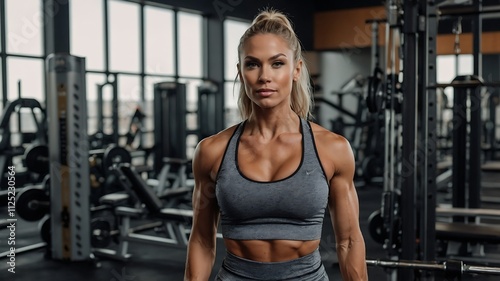 Obraz premium Strong Female Fitness Model Posing in a Modern Gym