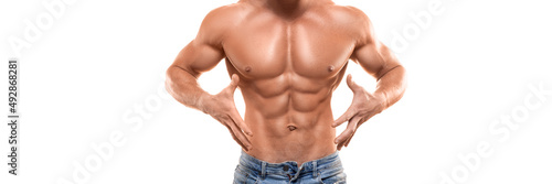 © Stavros, Fototapeta premium Strong healthy athletic man in jeans. Male torso isolated on white.