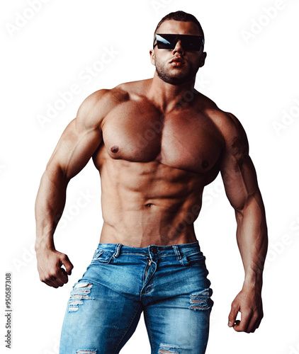 © chaossart, Naklejka premium Strong man bodybuilder in sunglasses posing