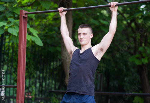 Fototapeta premium strong man doing pull-ups on a bar outdoor