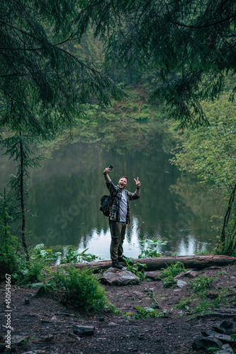 Fototapeta premium strong man hiker looking at mountain lake
