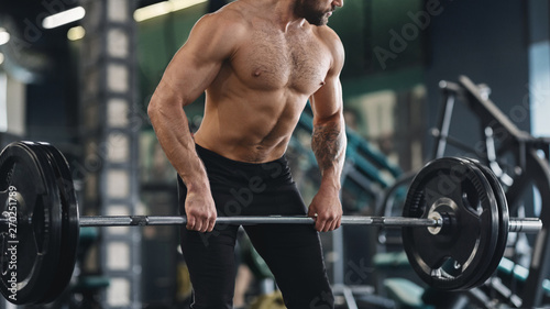 Naklejka premium Strong man with naked muscular body exercising with heavy barbell