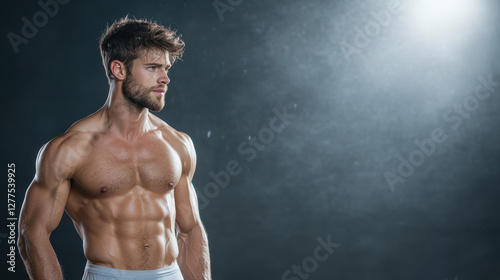 Fototapeta premium Strong man with six pack abs in dramatic lighting and dark background