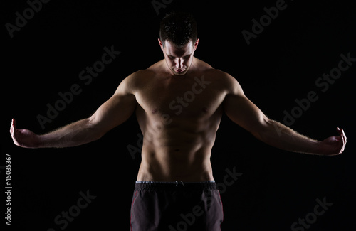 Fototapeta premium Strong muscular man posing on black