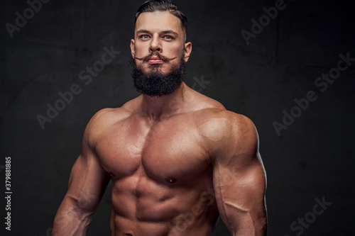 © Fxquadro, Fototapeta premium Strong naked guy with black beard and modern hairstyle posing in dark and gray background.