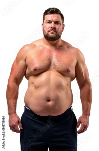 © chelmicky, Fototapeta premium Strong overweight man showing dad bod on white background