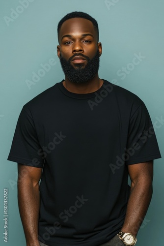 © BrandwayArt, Naklejka premium Strong portrait of a man in a black shirt against a solid backdrop