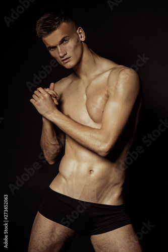 Fototapeta premium Strong stripped muscle male model in black underwear on black isolated font...