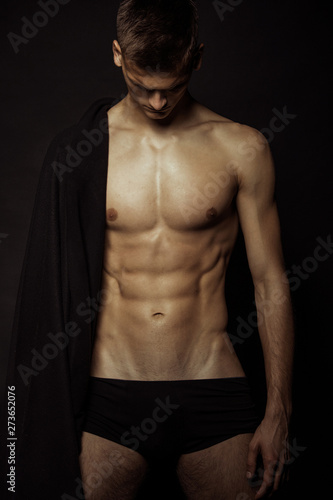 Fototapeta premium Strong stripped muscle male model in black underwear on black isolated font background