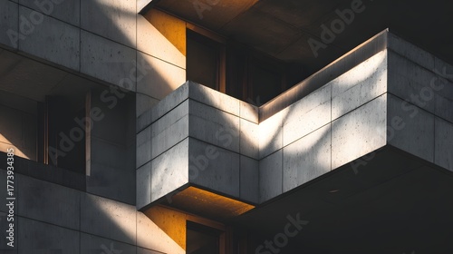 Obraz premium Strong sunlight creates dramatic geometric shadows across a modern building...