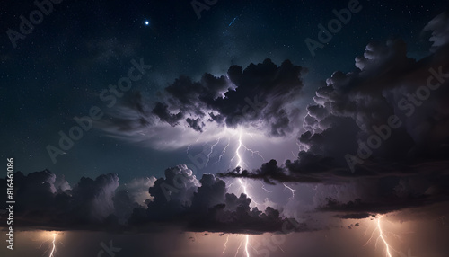 © MDNAJIMODDIN, Naklejka premium Strong thunderstorms light up the night sky like volt lightning. Generative Ai