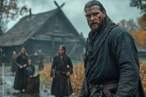 Fototapeta premium Strong warrior stands in a historic village during a gloomy autumn day with villagers in the background