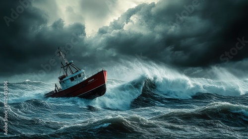 Naklejka premium Struggling Boat in Stormy Ocean Waves
