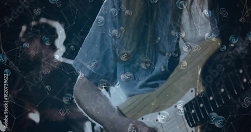Fototapeta premium Strumming guitarist in faded denim shirt playing electric guitar on dim stage, with Bitcoin bubbles