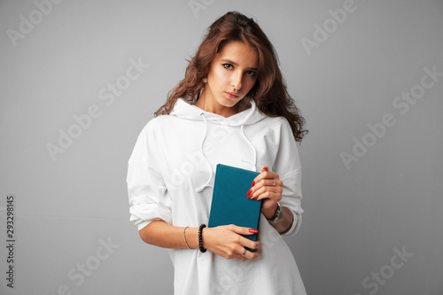 Fototapeta premium Student girl teenager in white hoodie holding a book in her hands over a grey...