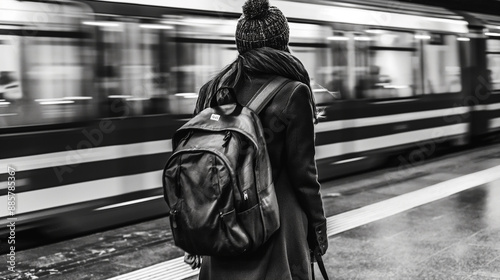 © Andres Mejia, Obraz premium Student girl waiting for train passing by in subway station