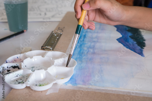 Fototapeta premium Student's hand with brush drawing on paper for creation picture abstract of...