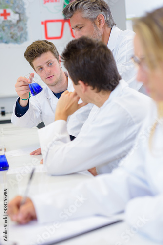 © auremar, Obraz premium Student showing glass flask to classmate