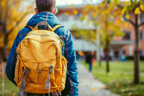 Obraz premium Student walking to school on the first day of September with backpack, autumn...