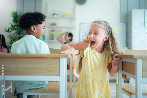 © Wosunan, Obraz premium Students learn and study in a classroom of school where youngsters sit and listen attentively.