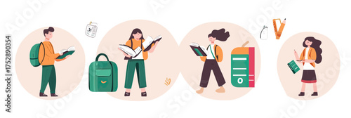 Fototapeta premium Students studying books reading preparing school backpack academic learning education concept flat minimalist vector illustration set