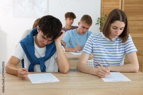 © New Africa, Fototapeta premium Students taking exam at wooden table indoors