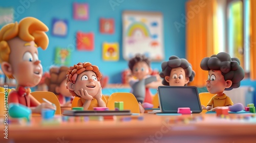 Fototapeta premium Students using educational apps on tablets, colorful classroom setting, and a...