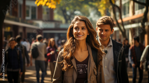 Naklejka premium Students walk together on a modern college campus, symbolizing their...