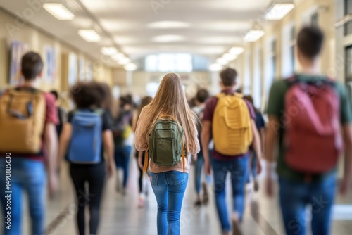 Naklejka premium Students walking to class in a busy hallway during school hours