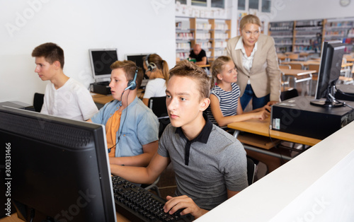 Fototapeta premium Students working with computers in classroom