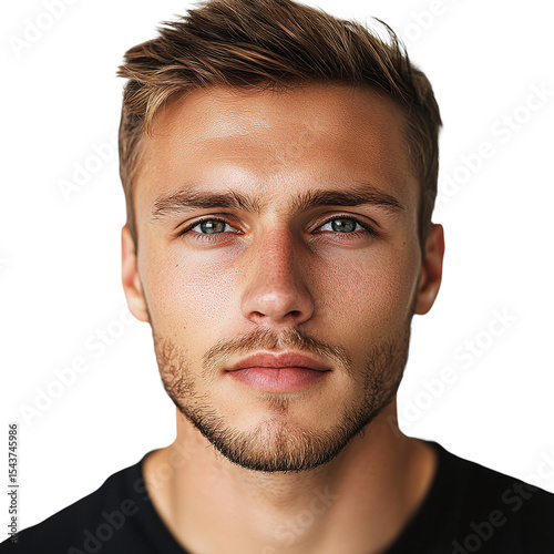 © Infinity Lens, Obraz premium Studio close-up portrait of young handsome man with calm facial emotion, looking straight ahead. isolated on transparent background.