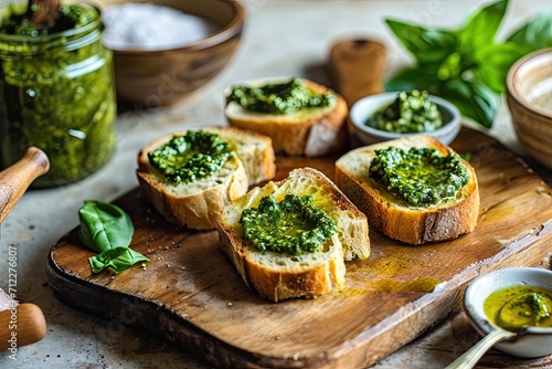 Fototapeta premium Studio photo of fresh pesto being spread on small bread slices
