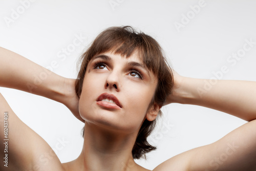 Naklejka premium studio portrait of a beautiful brunette girl with short hair looking up...
