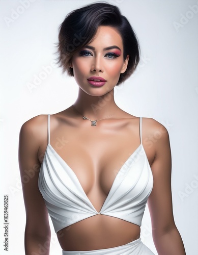 © Roberto, Fototapeta premium studio portrait of a brunette model with short hair wearing a low cut white dress with nude shoulders on white background, fashion photography
