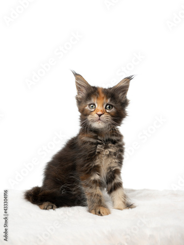 © furryfritz, Fototapeta premium studio portrait of a cute calico maine coon kitten sitting looking at camera on white background