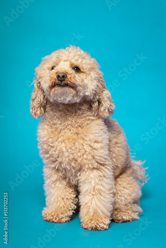 Fototapeta premium Studio portrait of a expressive abricot poodle on blue background
