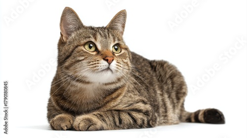 © Dao, Fototapeta premium Studio portrait of a sitting tabby cat looking forward against a white back ground