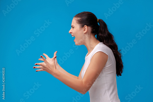Fototapeta premium Studio portrait of a young beautiful woman in a white t-shirt against a blue...