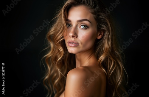 © Pete, Fototapeta premium Studio portrait of beautiful woman with long curly blonde hair against black background. Woman posing with elegance. Gorgeous features highlighted by pro makeup. Sensual expression, perfect skin