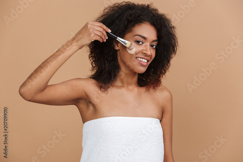 © Drobot Dean, Fototapeta premium Studio portrait of content african american woman smiling and applying concealer at her face with makeup brush, isolated over beige background