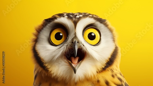 © hamad, Fototapeta premium Studio portrait of surprised owl, isolated on yellow background.