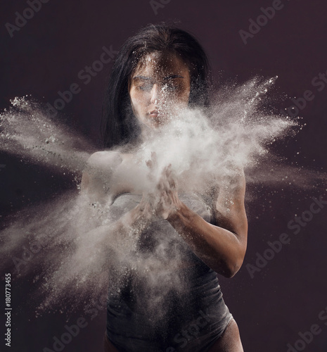 © VlaDee, Fototapeta premium Studio portrait of woman dancing with flour