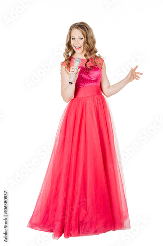 Naklejka premium Studio shot beautiful young singing girl in elegant red dress
