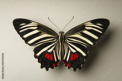 Fototapeta premium Studio-shot black-white butterfly, red accents, neutral background, nature...