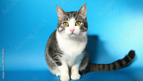 Fototapeta premium Studio shot of a gray and white striped cat sitting on blue background
