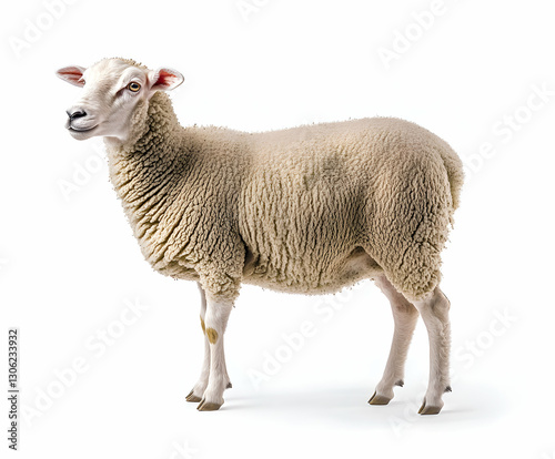 © Gustav, Naklejka premium Studio shot of a sheep standing in a white backdrop showcasing its wool