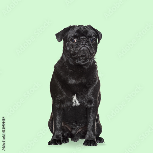 Obraz premium Studio shot of adorable black pug sitting and looking forward on transparent...