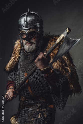 Naklejka premium Studio shot of antique old age viking with axe