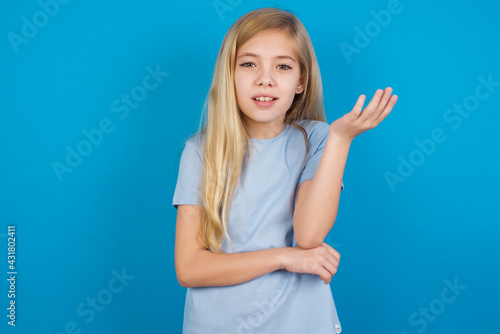 © Jihan, Fototapeta premium Studio shot of frustrated beautiful Caucasian little girl wearing blue T-shirt over blue background gesturing with raised palm, frowning, being displeased and confused with dumb question.