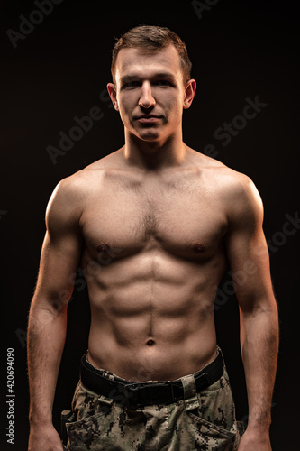 Fototapeta premium Studio shot of muscular topless military man on black background